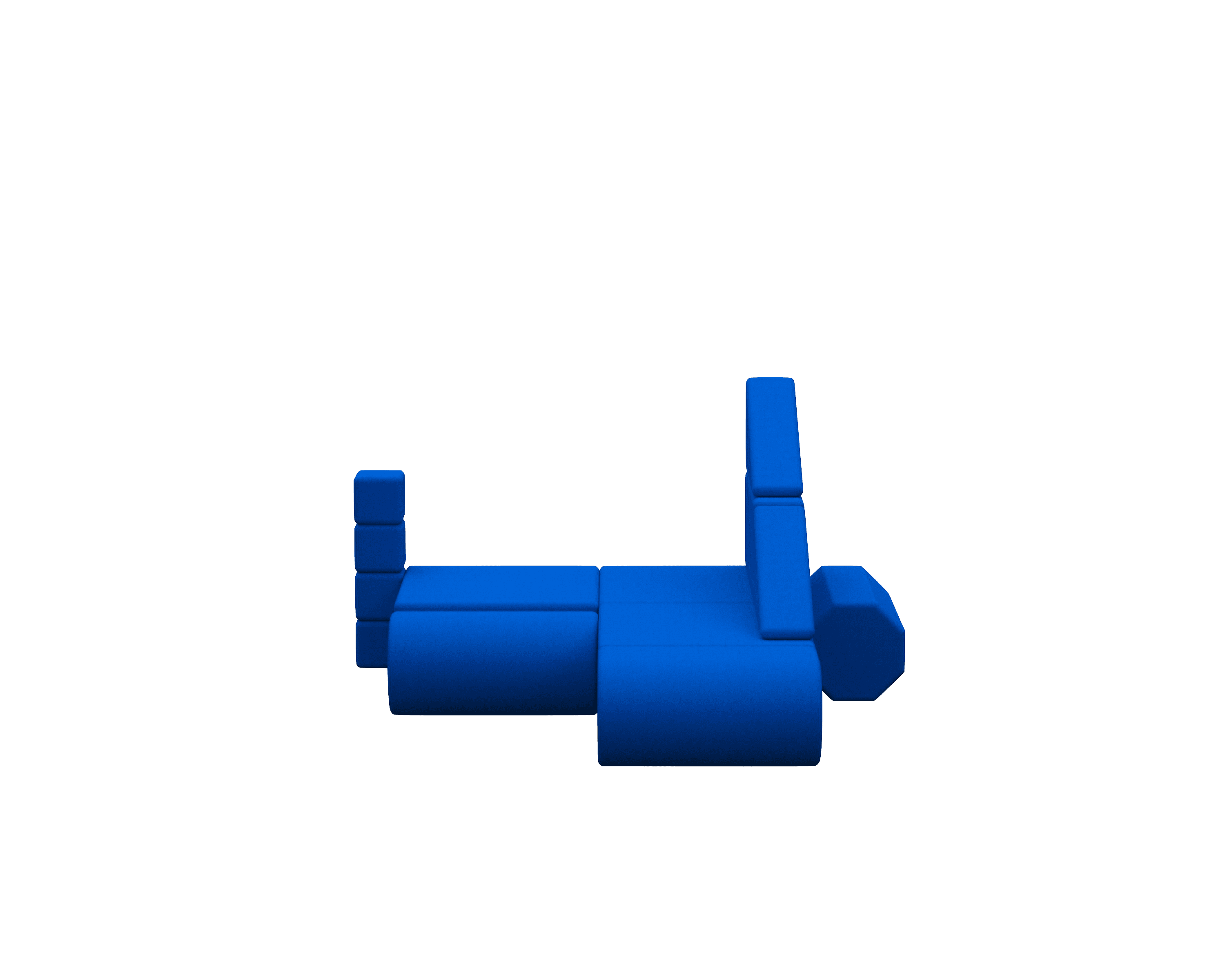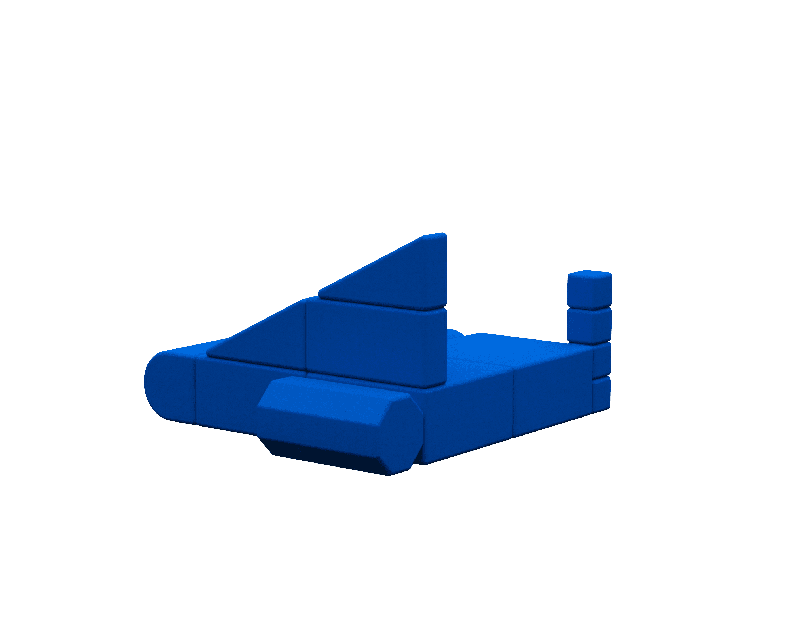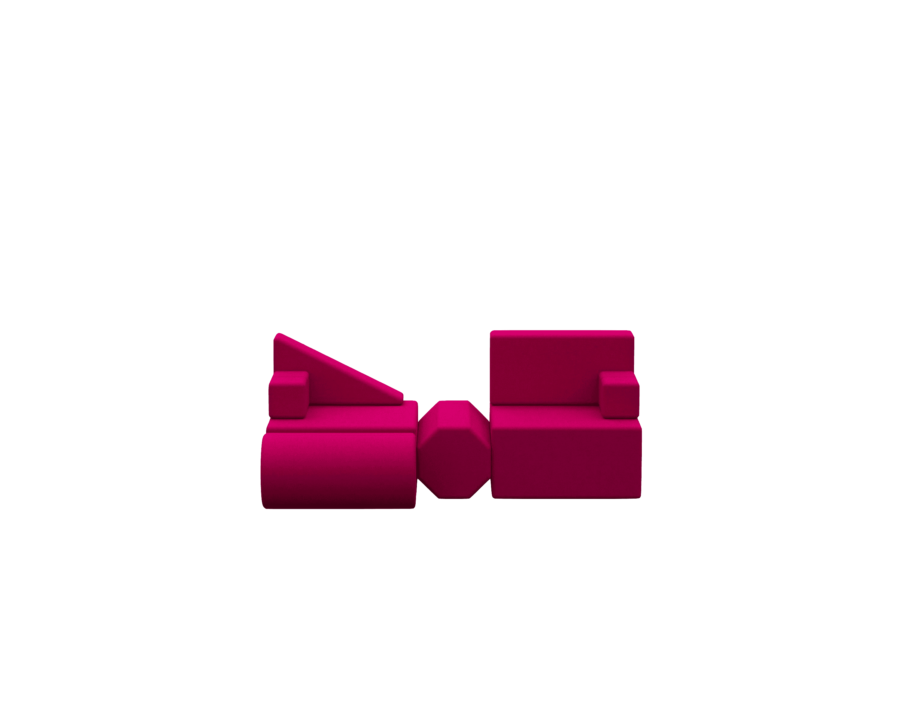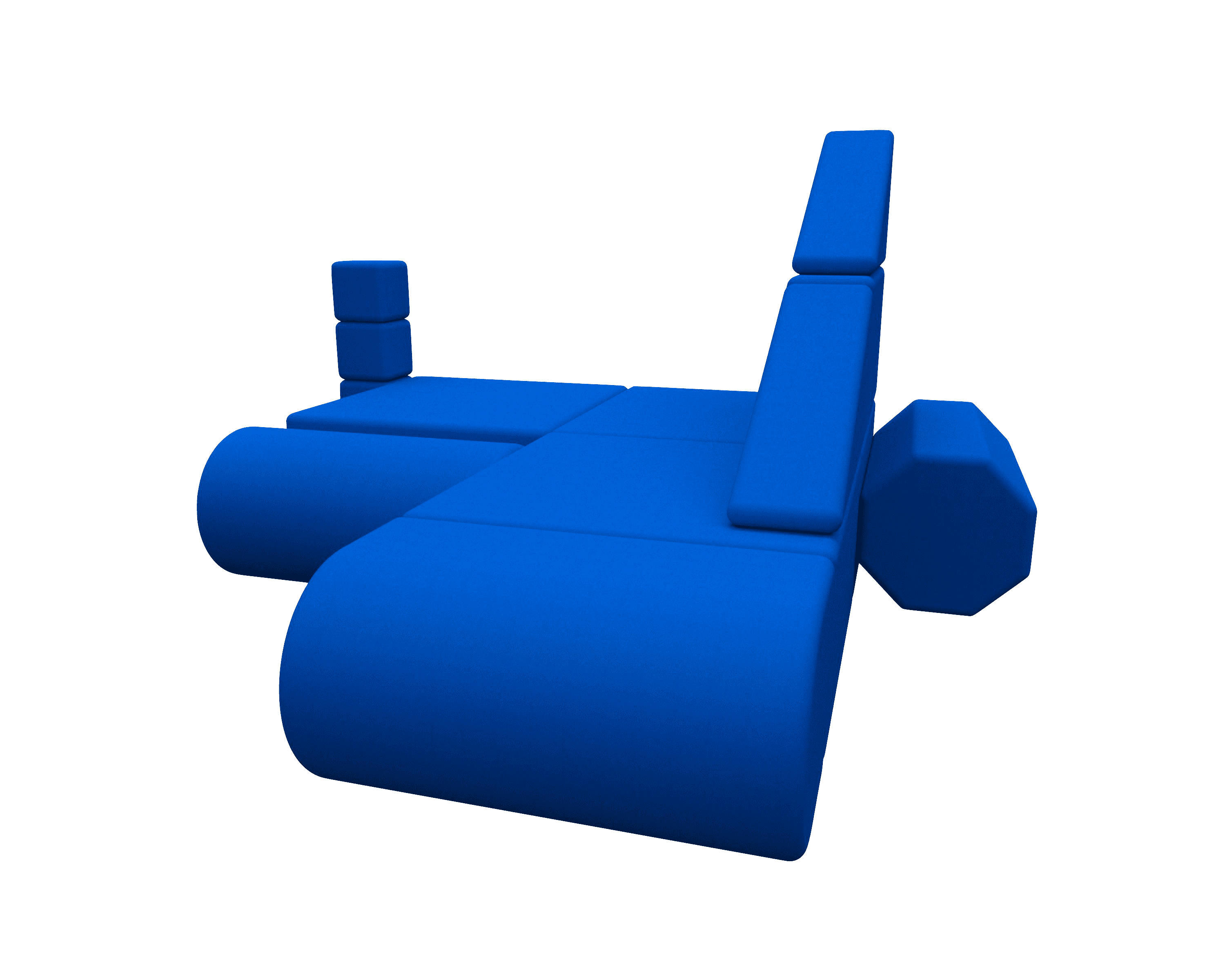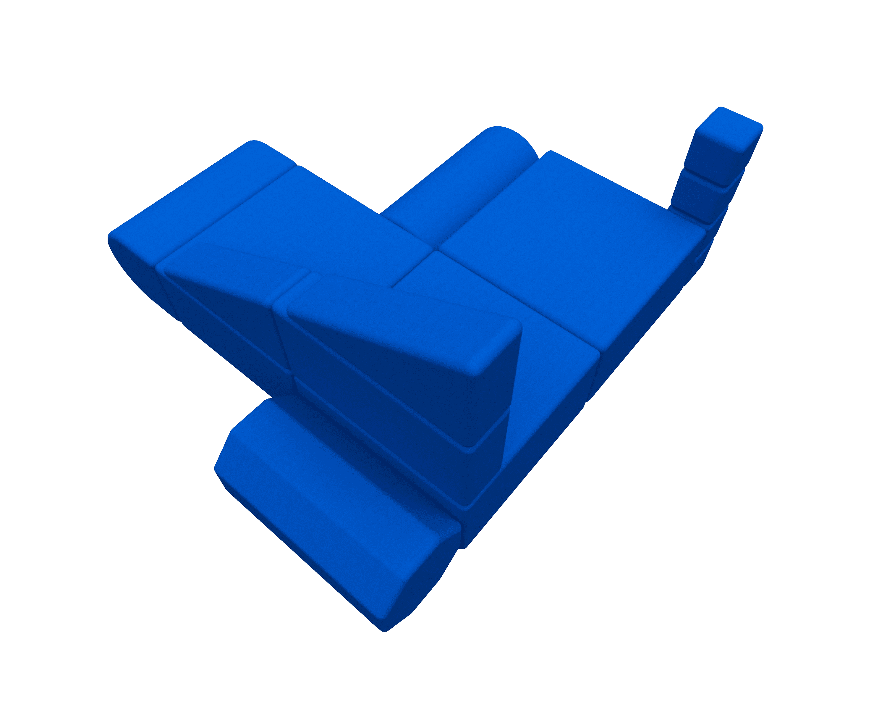 The seemingly infinite variations of PILOT are set up by the first arrangement that was created — a 3-seater. Three seats of equal dimensions, three backrests the same except resulting from a diagonal bisecting of the first three ottomans, and four cuboidal armrests. Pieces are added or subtracted in equal proportion depending on seating necessities.