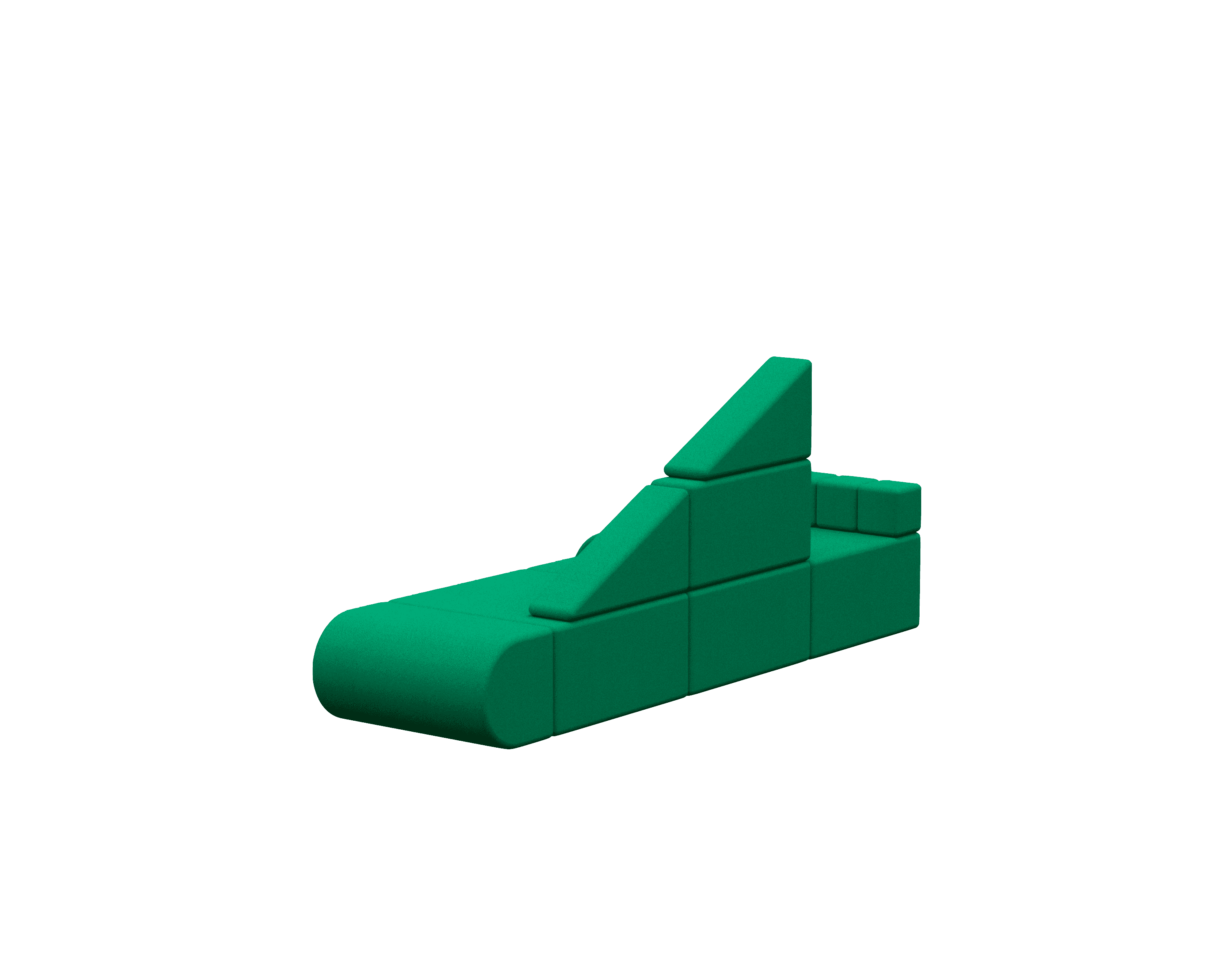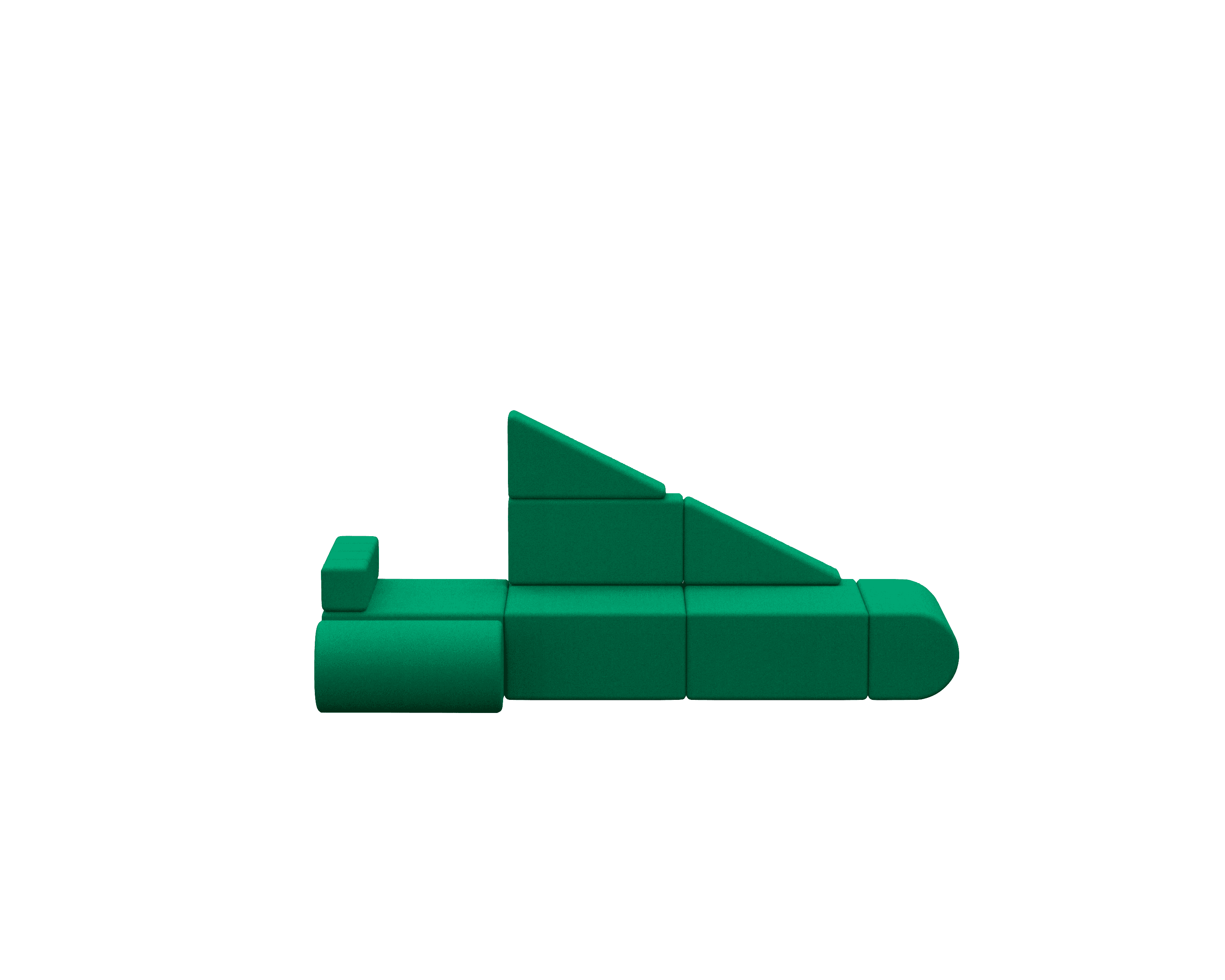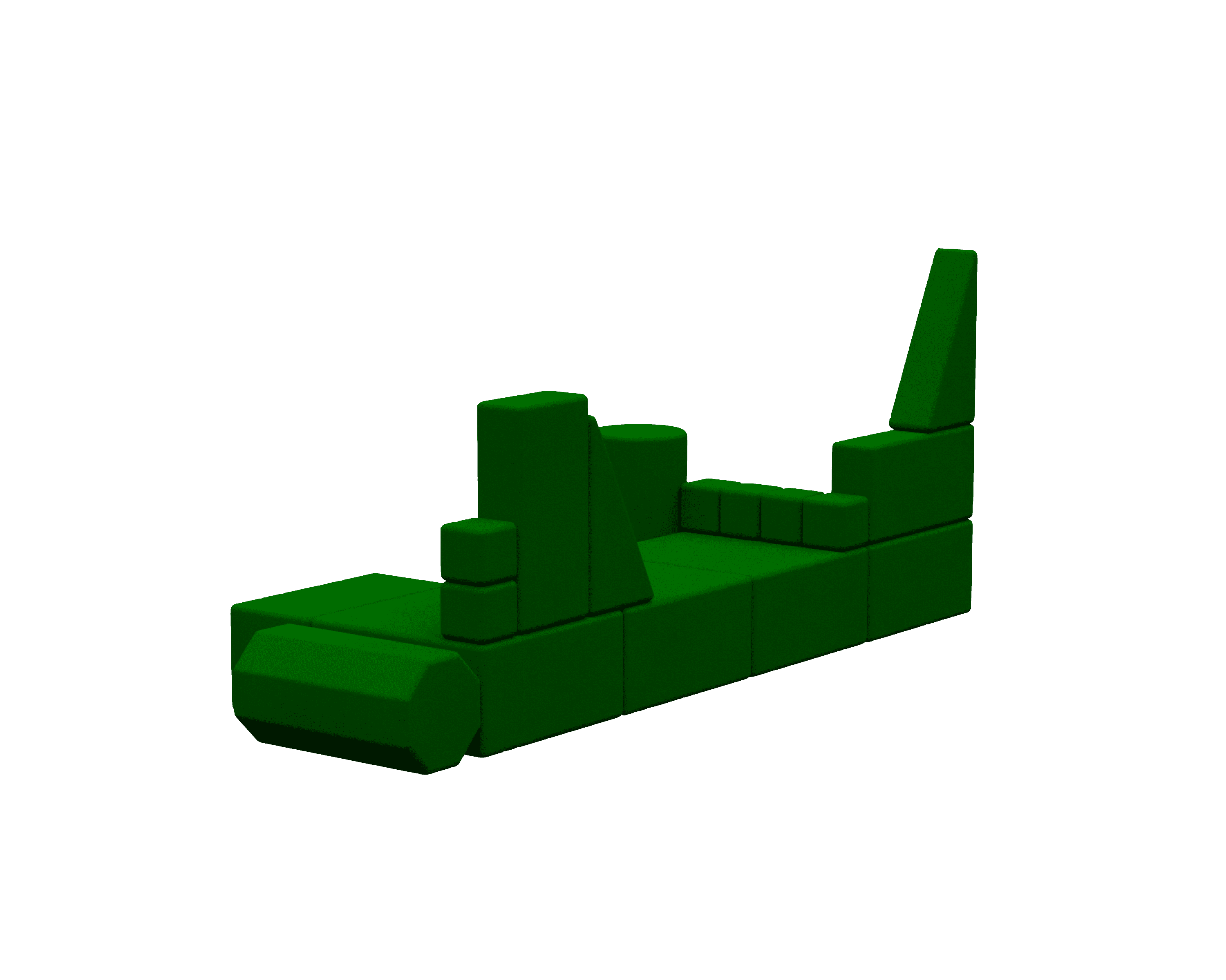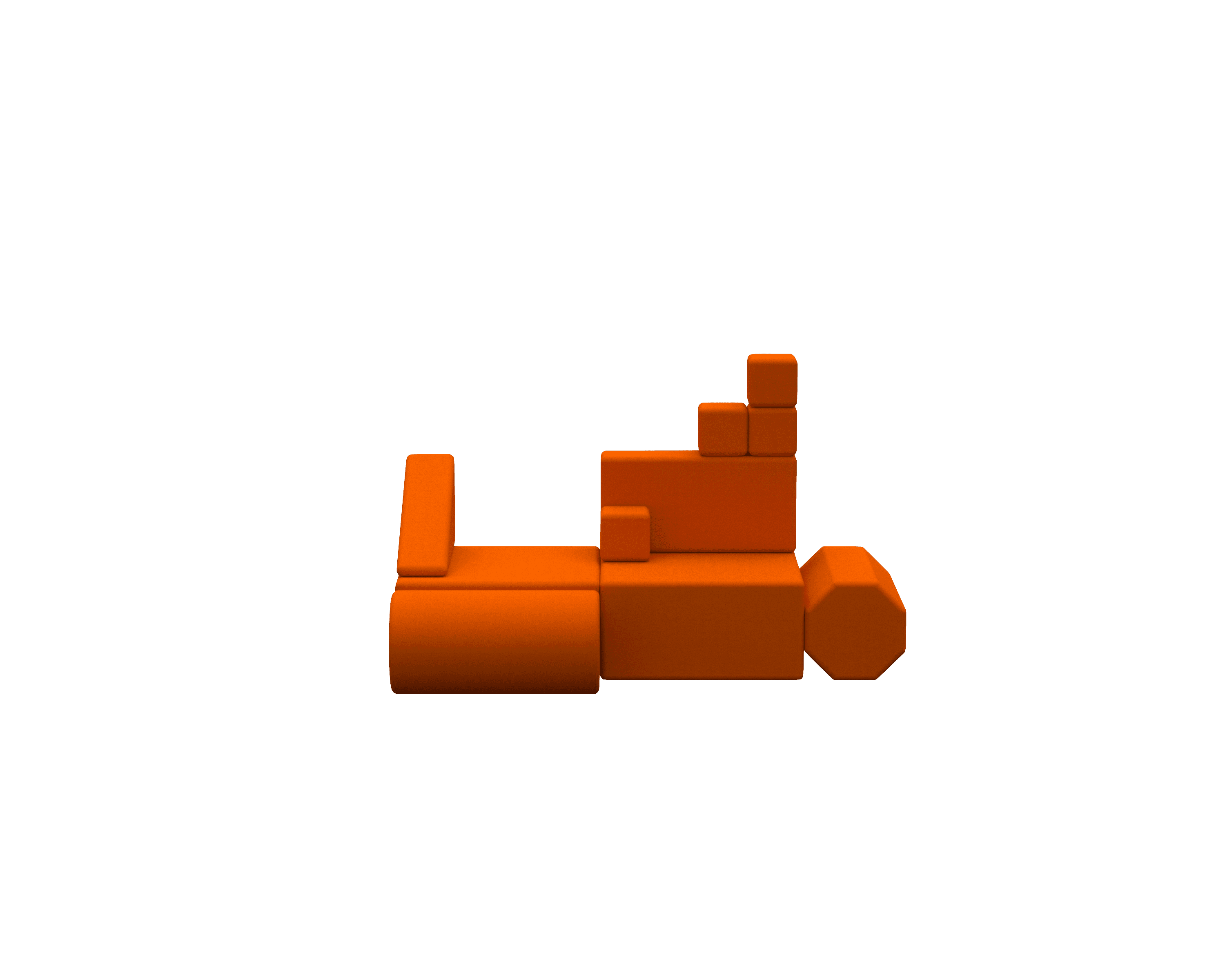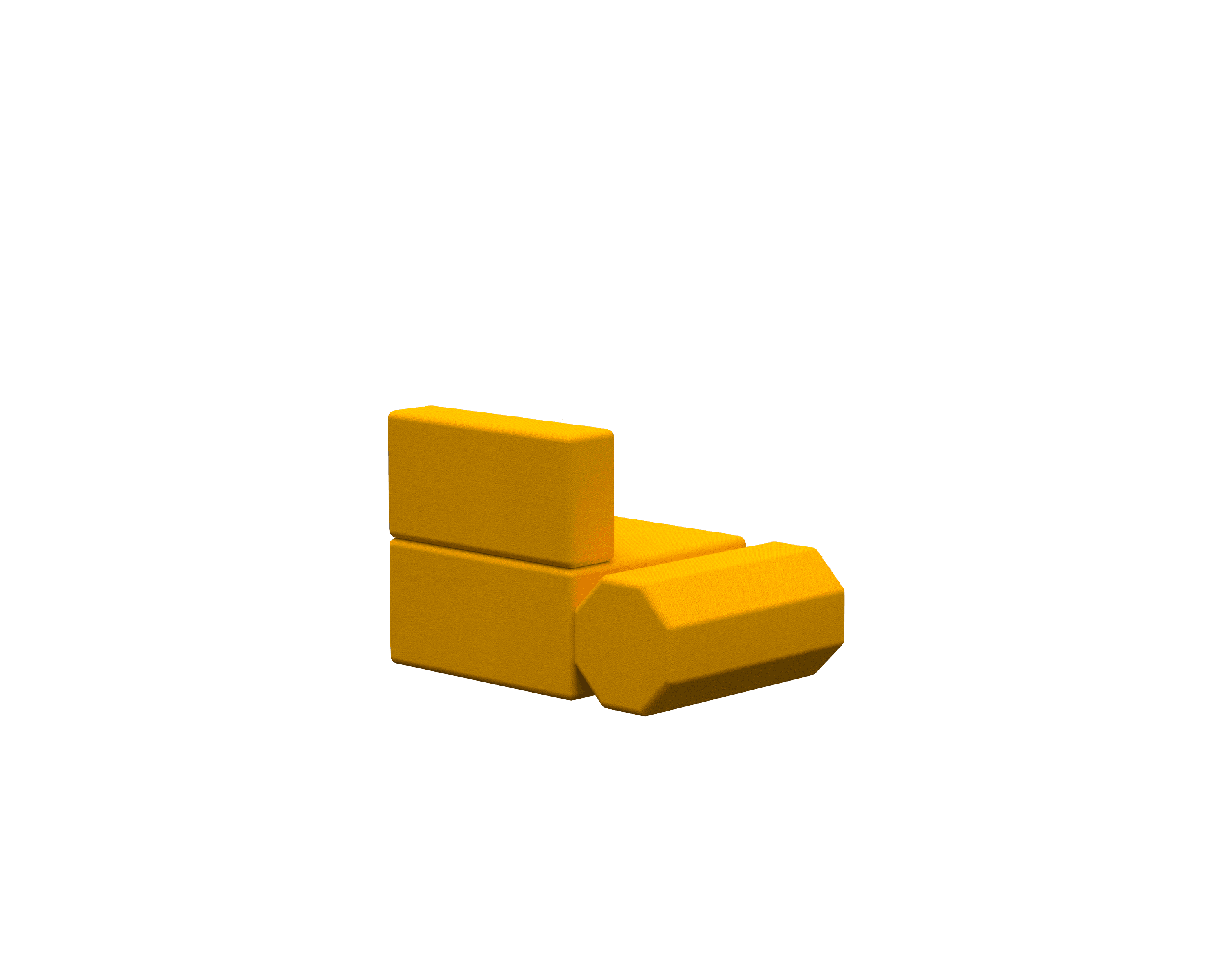 The seemingly infinite variations of PILOT are set up by the first arrangement that was created — a 3-seater. Three seats of equal dimensions, three backrests the same except resulting from a diagonal bisecting of the first three ottomans, and four cuboidal armrests. Pieces are added or subtracted in equal proportion depending on seating necessities.