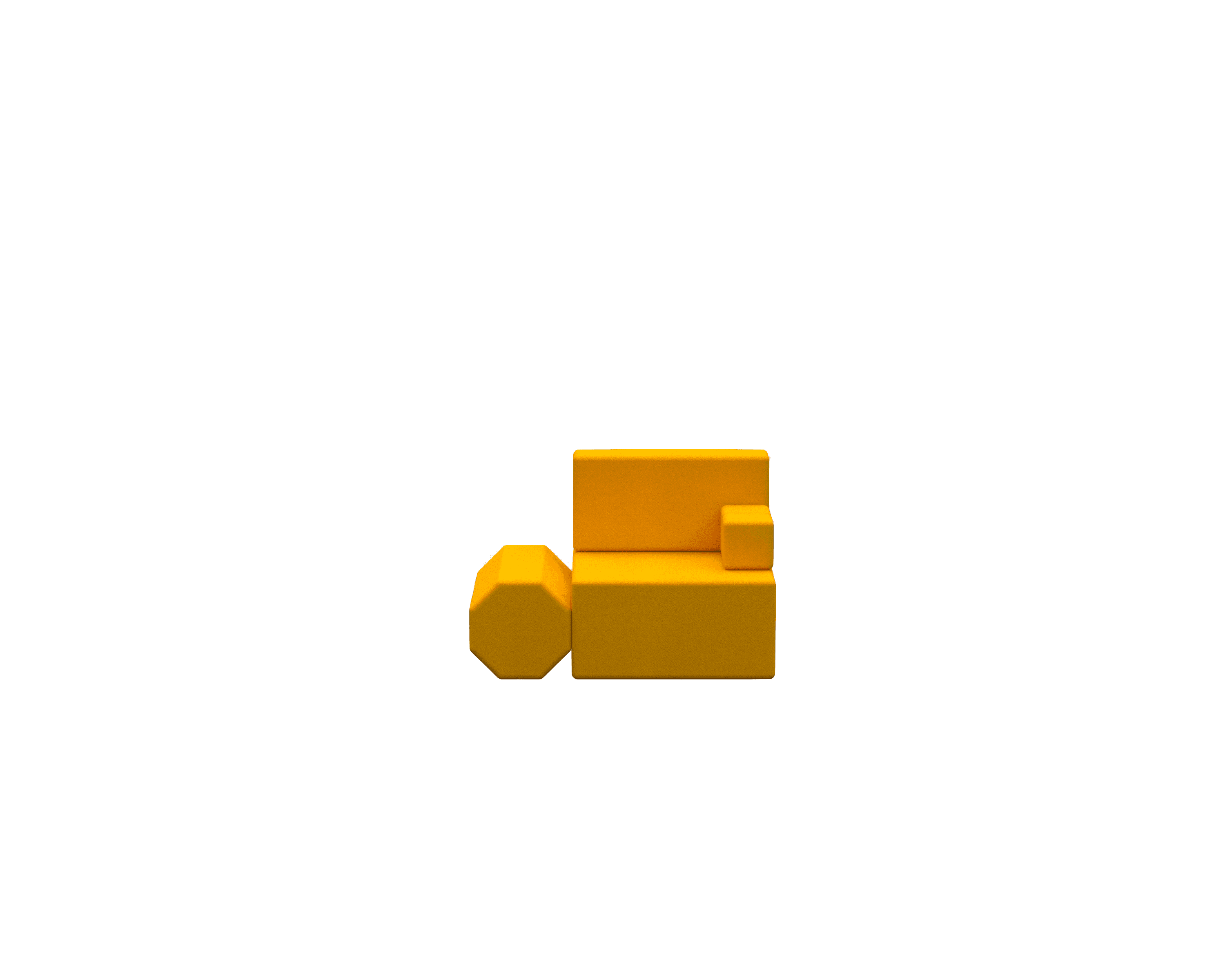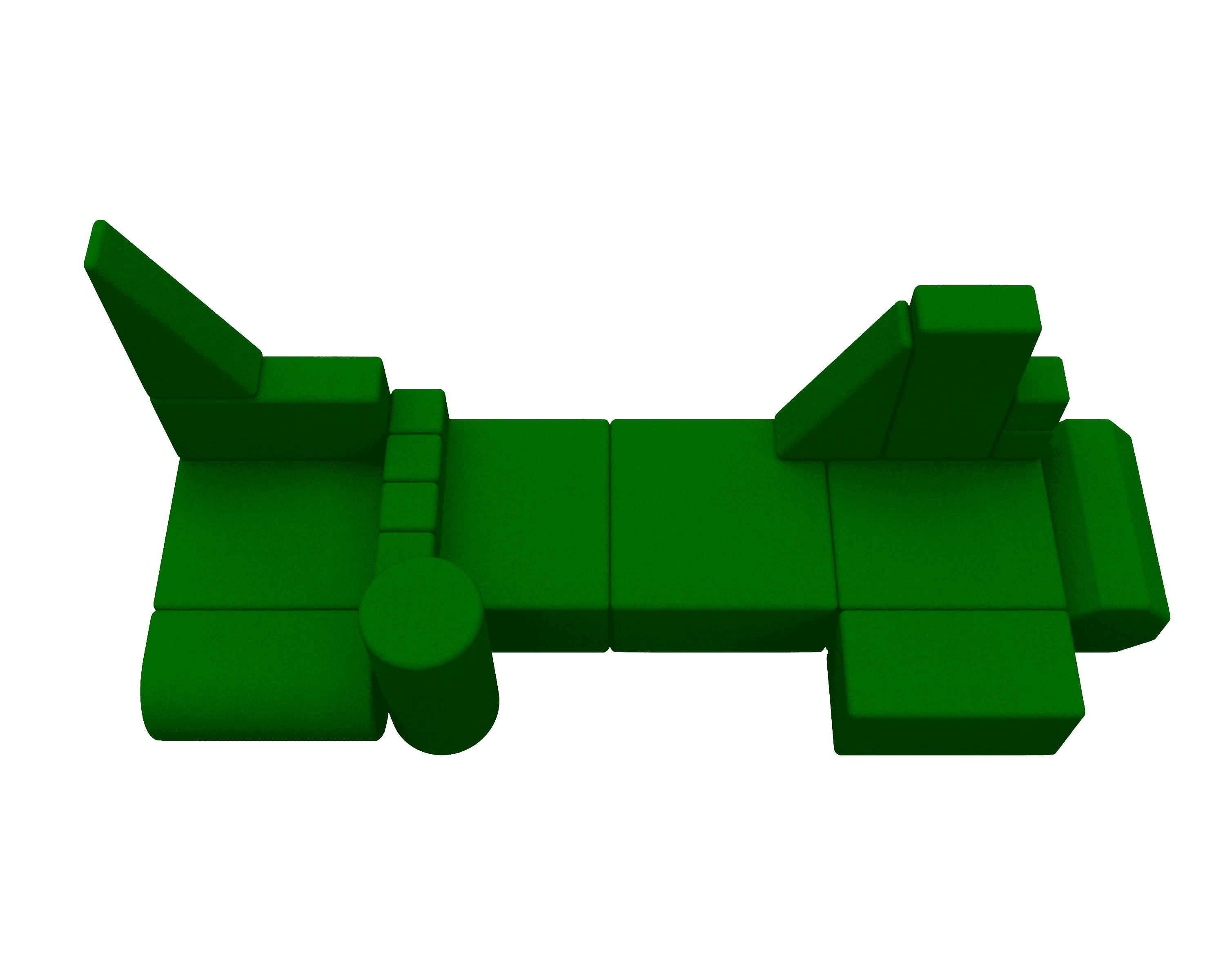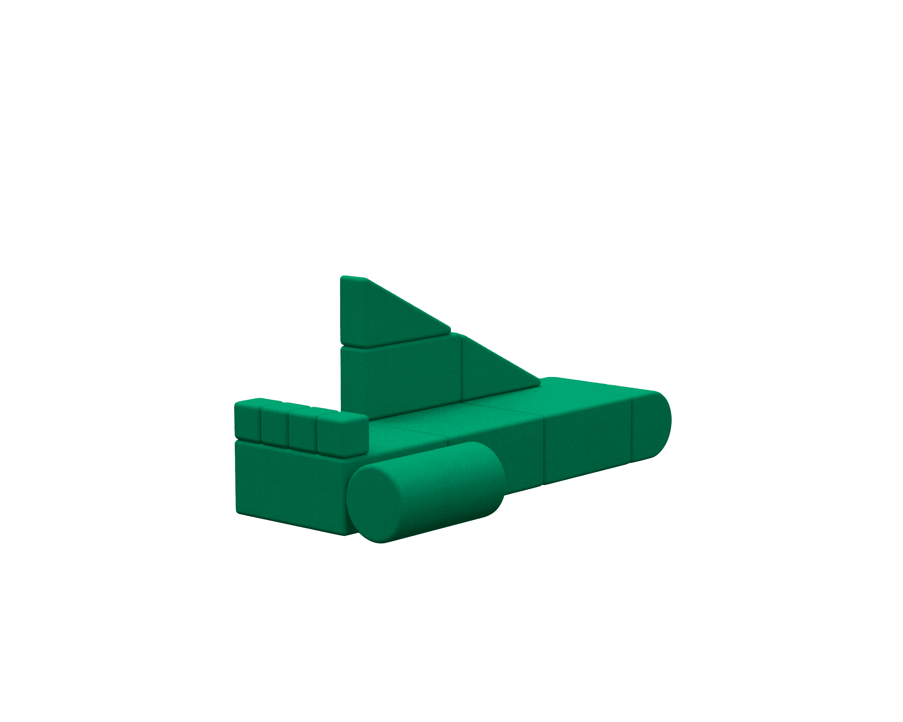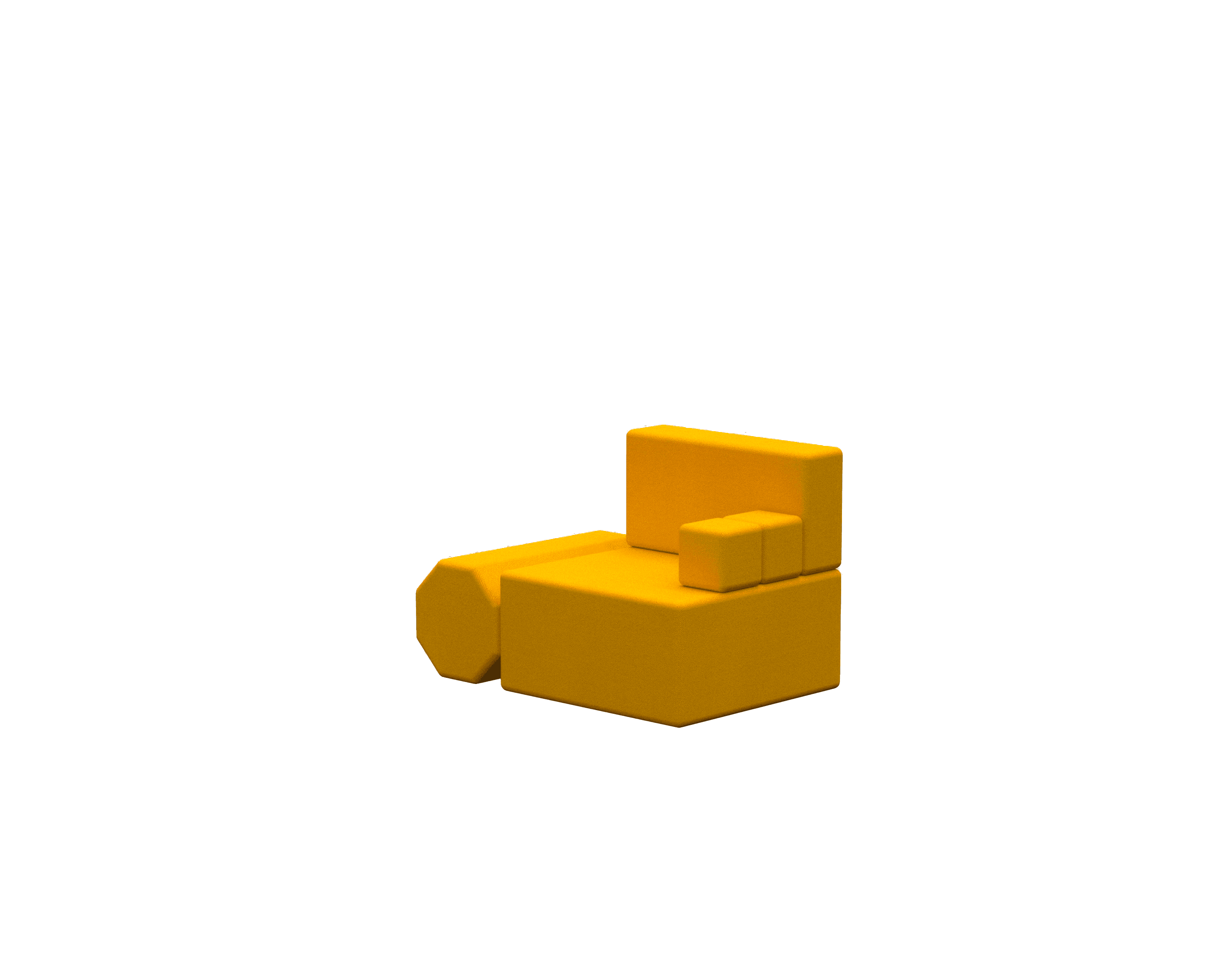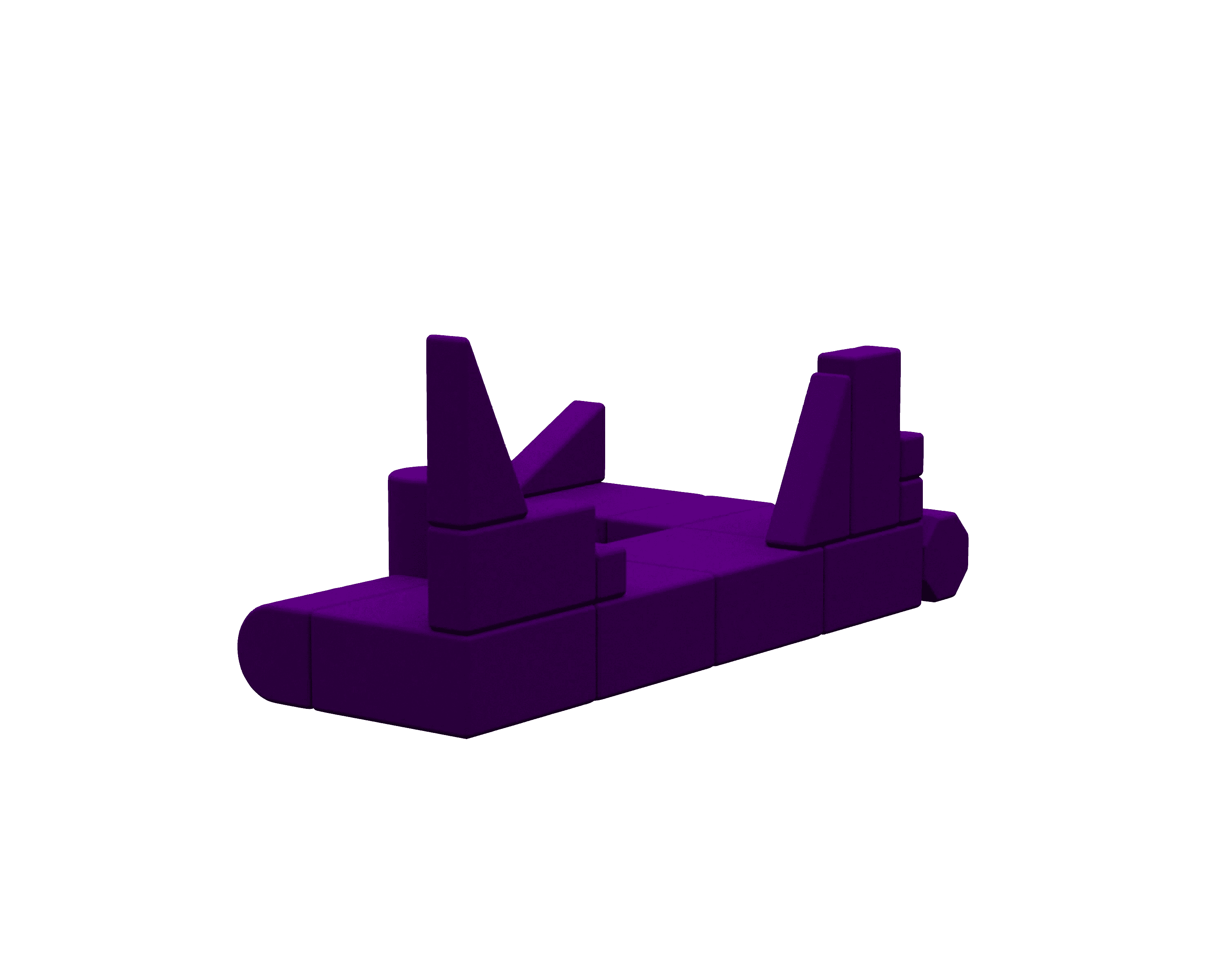 The seemingly infinite variations of PILOT are set up by the first arrangement that was created — a 3-seater. Three seats of equal dimensions, three backrests the same except resulting from a diagonal bisecting of the first three ottomans, and four cuboidal armrests. Pieces are added or subtracted in equal proportion depending on seating necessities.